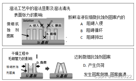 为了解决显微抗蚀剂图案与各种溶液之间起作用的表面张力的问题。 图2显示的是由于超细微抗蚀剂图案的细微化、狭窄化、高长宽比化而产生的新问题的模式图。 在显影·清洗等湿法工艺中,由于光刻胶图案变窄·高长宽比化,在表面张力的影响下,各种溶液向光刻胶图案间的侵入·循环·排出受到阻碍(图2上图)。 因此,没有足够的新鲜溶液供应到微细化的光刻胶图案内部的各个角落,导致微细化图案的显影不良和图案底部的清洗不良。 而且,在利用微细图案的电镀和蚀刻等湿法工艺中,如果向图案内部的新鲜溶液循环受到阻碍,反应就无法进行,因此会发生电镀不良和蚀刻不良等各种问题。 另一方面,在干燥过程中,由于毛细力的影响,在超微细化和高纵横比的抗蚀剂图案的间隙中残留大量溶液,并且由于图案内部的毛细力和外部的气压之间的差,在图案外部产生力。