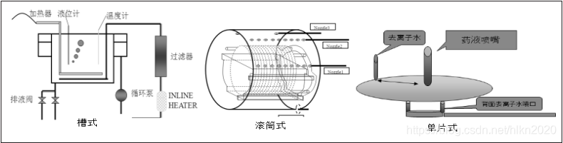 四、后段清洗机台后段清洗机台按作业方式主要分为槽式,滚筒旋转式(semitool 与PR200Z)与单片作业 (SR2000) 三种类型。槽式比较常见,药液处理槽的常见结构包括内外槽,循环管路,过滤器,循环泵,液位与温度传感器等,所用药液主要有 EKC 与 ACT960,其优点是出货量大,一次能够作业50 片硅片,这也导致如果机台发生问题,受影响的硅片数量还有因为药液使用的时间比较长,随着作业量与时间的增加,其含水量会慢慢下降导致聚合物去除能力下降,所以含水量的控制成为关键,一般通过部分换液补充新液来控制。滚筒式现在主要有 Semitool 与 PR200Z 两种机型,作业时将最多 26 片硅片放进滚筒里,通过内腔里的喷嘴将药液,水,氮气喷到硅片表面,并以不同的转速切换来进行清洗与干燥。PR200Z 是 semitool 的改进型,主要区别是 PR200Z分内外两个腔并能分离,即内腔处理药液步,外腔进行水洗和干燥,以实现更好的颗粒去除能力,且 PR200Z 有着更快速的转速切换能力与更多的药液喷嘴,所以清洗能力比semitool 强。滚筒式也因一次作业量小,逐渐被槽式所替代。单片式机台以SR2000 为例,机台为单枚式旋转喷淋式。主要应用为金属配线刻蚀后生成聚合物的去除。机台结构为 独立作业的 4 个腔,每个腔有移动式喷嘴两个,一个喷药液, 一个喷水与氮气。作业时硅片背面中心靠真空吸附,转速为0~5000rpm,在旋转时硅片背面喷去离子水,以防止药液回流到背面。单片式的主要优点是作业时间短,能有效的防止 金属过刻蚀或铝腐蚀的发生,且因为单枚作业,药液消耗少, 机台出异常时影响范围小。随着硅片尺寸的变大,比如 12 寸生产线,因槽式体积过于庞大,单片式已成为大尺寸硅片 清洗的趋势 ,