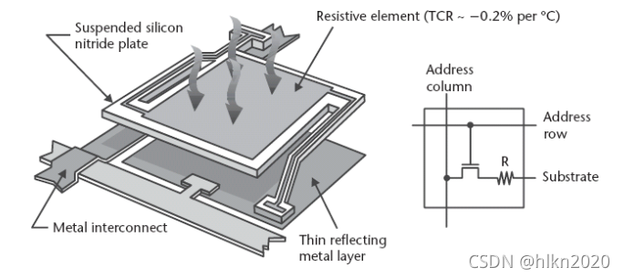 .氮化硅板和它正下方的薄反射金属形成一个 四分之一波谐振腔 增加红外线 吸收