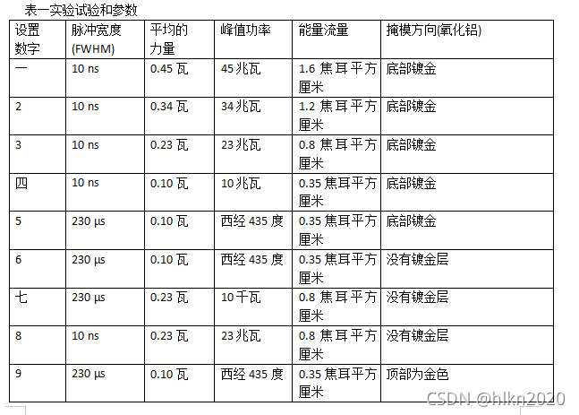 进行了九个不同的实验,包括短脉冲束和长脉冲束,每个装置都进行了多次试验。表1列出了每个装置的具体实验参数。这九个实验的结果描述如下。