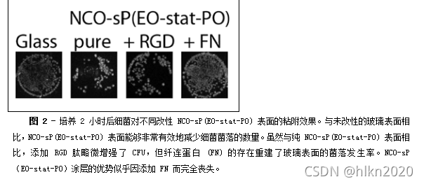 为了量化 NCO-sP(EO-stat-PO) 涂层和 RGD 或 FN 功能化表面上的细菌粘附,我们使用了根据 Shirai 等人 (45) 修改的方法。玻璃基材用 NCO-sP(EO-stat-PO) 包被,并如前所述用 RGD 肽或纤连蛋白进行功能化 (46)。将 10 微升 (105 CFU) 过夜培养的大肠杆菌 (108 CFU/mL) 均匀分布在基材表面上,并用未涂覆的玻璃盖玻片覆盖。在加湿培养箱中在 37°C 下培养 2 小时后,使用 5 mL 无菌 PBS(0.01M,pH 7.4)洗涤每个涂覆的玻璃基材。然后,将清洗过的表面印在琼脂板上,然后在最佳温度下孵育过夜。比较了每种基质上粘附的活细菌的数量。典型结果如图 2 所示。