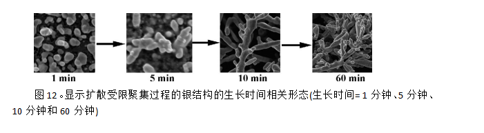 在硅的自选择性化学镀中,树枝状金属镀层对SiNW阵列的形成起着重要作用。银/金枝晶的形成应在扩散限制聚集模型的框架内考虑,该模型包括通过随机路径将颗粒粘附到选定的种子上形成团簇,以及颗粒扩散以粘附到生长的结构上,如图12所示。