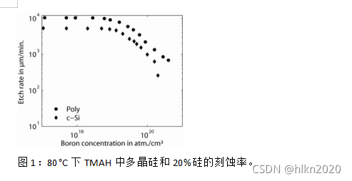 四甲基氢氧化铵(TMAH)是一种常用的硅蚀刻碱基。高硼掺杂样品的蚀刻速率降低7。图。1绘制了在20%和80°C浓缩的TMAH中硅和多晶硅蚀刻的蚀刻速率与掺杂浓度。蚀刻率随着硼浓度的增加而降低。蚀刻速率下降的原因是由于硅掺杂引起的诱导应力8。由于晶粒接头的存在,多晶硅的蚀刻率高于硅。硅的掺杂浓度的蚀刻速率下降幅度高于多晶硅。在晶体硅中,所有植入的硼原子在退火后都位于取代位点,并导致晶格应力。