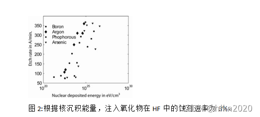 由于离子注入二氧化硅的键断裂使其对氢氟酸(HF)9更具反应性。在注入硼、磷、氩和砷的氧化物上,测量了二氧化硅在3%氟化氢中的腐蚀速率。图。图2绘出了蚀刻速率与核沉积能量的函数关系,因为它是描述对靶的损伤的参数。