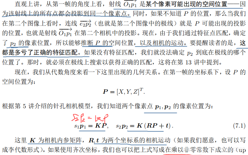 就可以通过这些二维图像点的对应关系,恢复出在两帧 之间摄像机的运动。这里“若干对”具体是多少对呢?我们会在下文介绍。