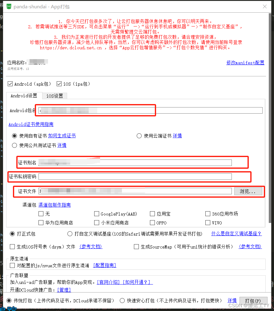 打包安卓:1.云打包使用云端证书(快捷);2.去生成自己的证书(找网站)。