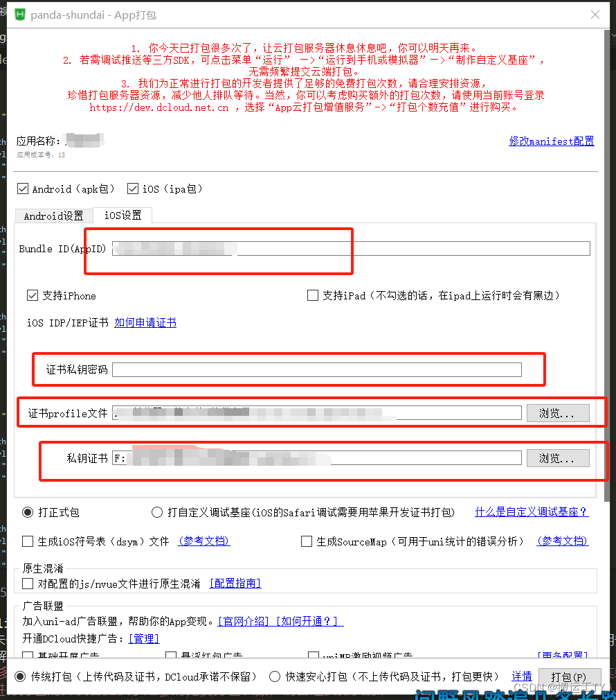打包ios:比较麻烦,申请苹果开发者账号(要钱/年),通过开发者账号生成证书打包;