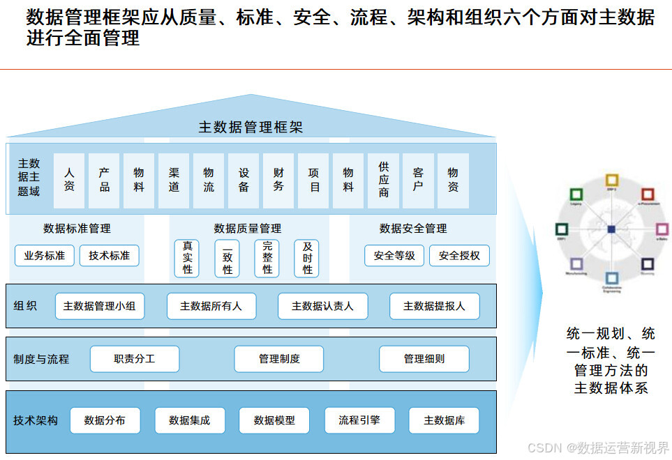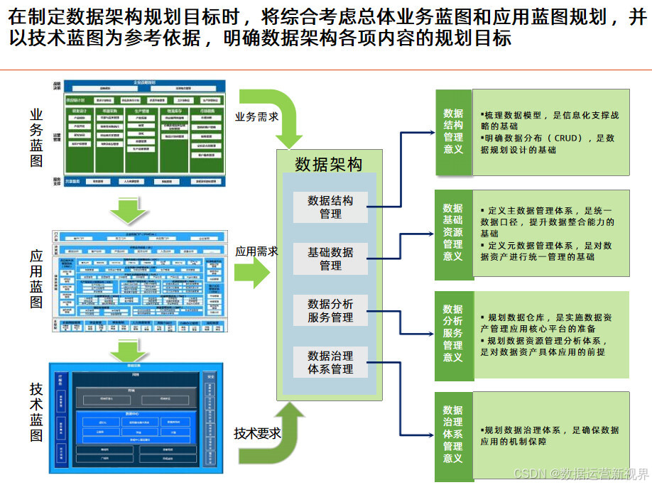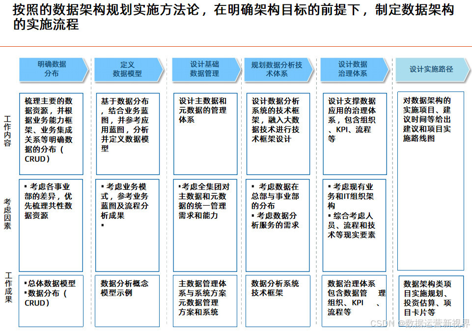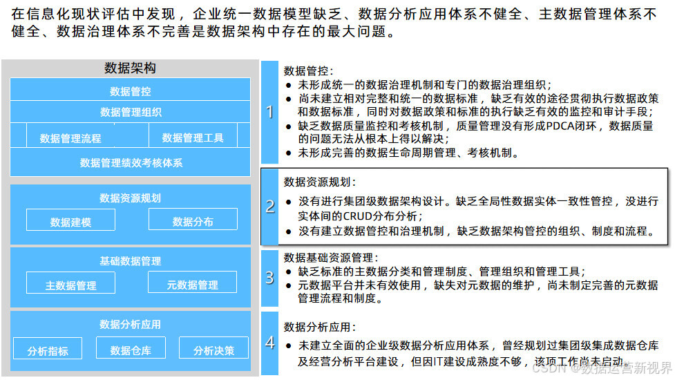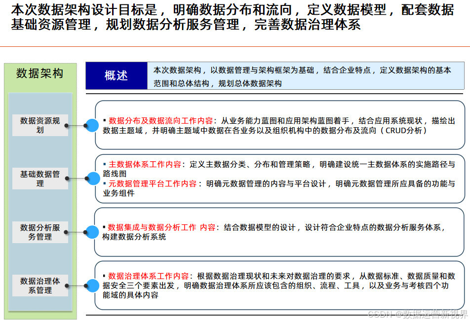 这个方案以业务蓝图和应用蓝图为出发点,技术蓝图为参考,站在为业务和管理赋能角度来设计蓝图来设计数据架构;且目标非常清晰:明确数据分布和流向 ,定义数据模型 ,配套数据基础资源管理 ,规划数据分析服务管理 ,完善数据治理体系;后面的方案基本延续这个思路展开。其中数据资源规划的主要任务是梳理企业级的数据模型,业务能力模型是数据资源规划的主要依据 ,要从业务领域出发梳理核心的数据;数据按照性质可以分为基础数据、交易数据和分析数据 ,做好基础数据的管理是数据架构优化的关键;数据管理框架应从质量、标准、安全、流程、架构和组织六个方面对主数据进行全面管理;决策支持系统是企业决策和经营管理的重要抓手 ,可以带来多方面的收益;数据治理体系涵盖组织架构、评价与考核、治理流程和治理工具四个业务域,逐步构建完整的数据管理制度和规范。最后讲了项目实施的计划建议,为项目决策者提供参考。