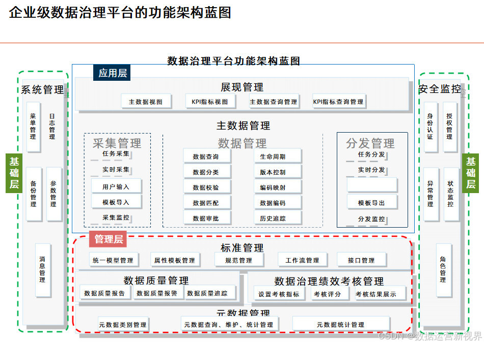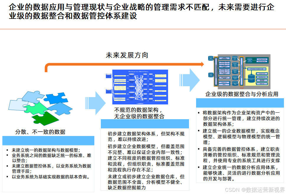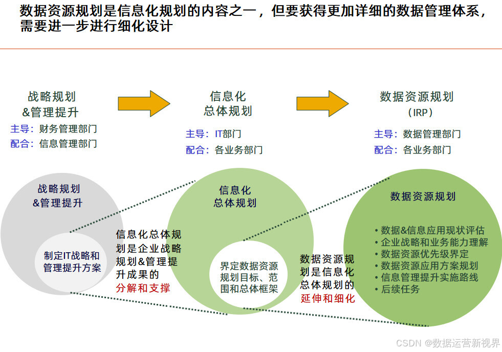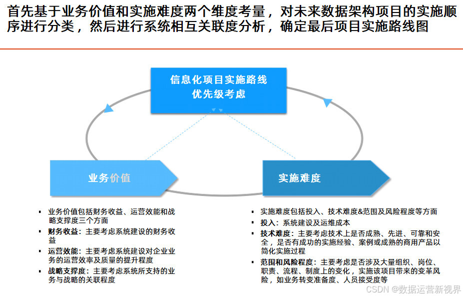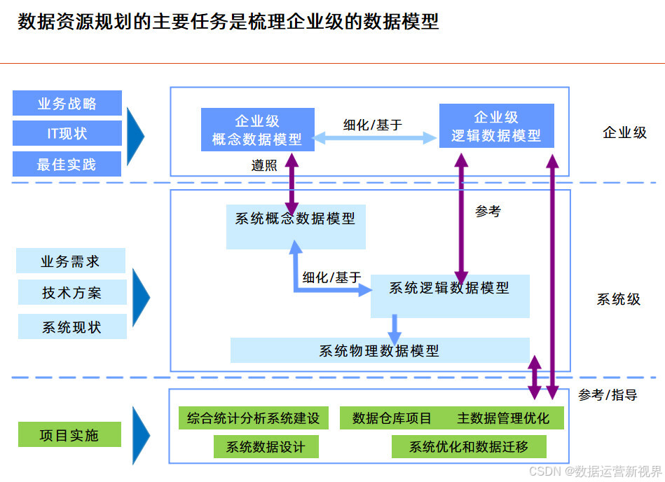 这个方案以业务蓝图和应用蓝图为出发点,技术蓝图为参考,站在为业务和管理赋能角度来设计蓝图来设计数据架构;且目标非常清晰:明确数据分布和流向 ,定义数据模型 ,配套数据基础资源管理 ,规划数据分析服务管理 ,完善数据治理体系;后面的方案基本延续这个思路展开。其中数据资源规划的主要任务是梳理企业级的数据模型,业务能力模型是数据资源规划的主要依据 ,要从业务领域出发梳理核心的数据;数据按照性质可以分为基础数据、交易数据和分析数据 ,做好基础数据的管理是数据架构优化的关键;数据管理框架应从质量、标准、安全、流程、架构和组织六个方面对主数据进行全面管理;决策支持系统是企业决策和经营管理的重要抓手 ,可以带来多方面的收益;数据治理体系涵盖组织架构、评价与考核、治理流程和治理工具四个业务域,逐步构建完整的数据管理制度和规范。最后讲了项目实施的计划建议,为项目决策者提供参考。