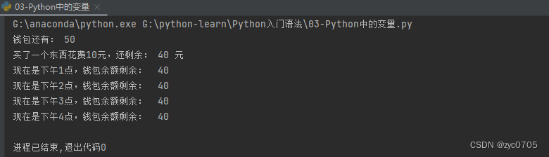 print("买了一个东西花费10元,还剩余:",money,"元")