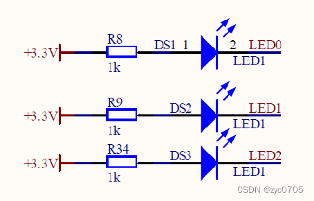 LED左边高电平。 当LED右边为低电平时,LED有电流通过,LED亮。反之,LED灭