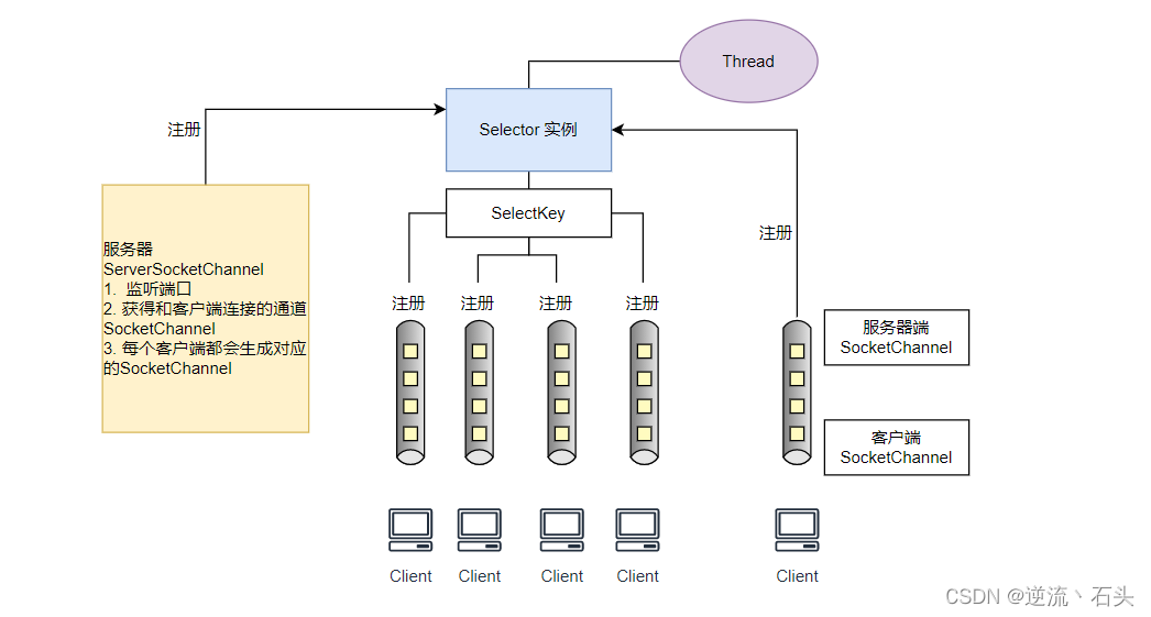 - 当客户端连接时,会通过 ServerSocketChannel 得到对应的 SocketChannel