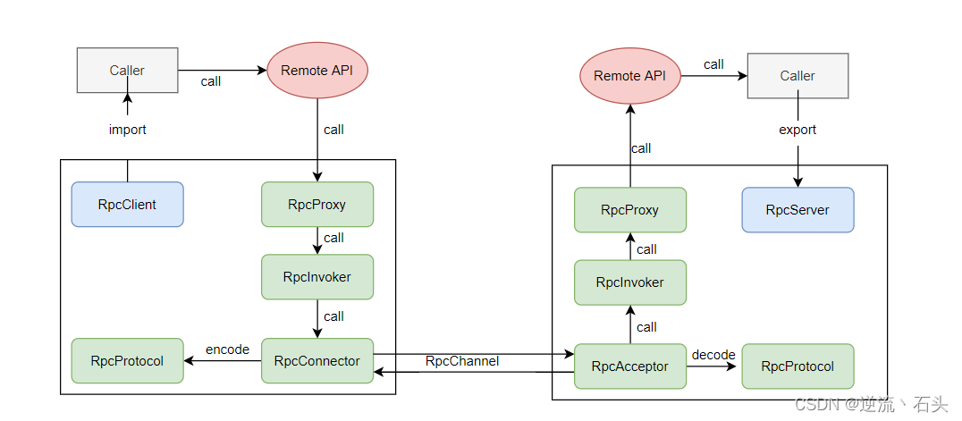 - RPC(Remote Procedure Call) : 远程过程调用,是一个计算机通讯协议,改协议允许运行于一台计算机的程序调用另一台计算机的子程序,而程序员无需额外地为这个交互作用编程