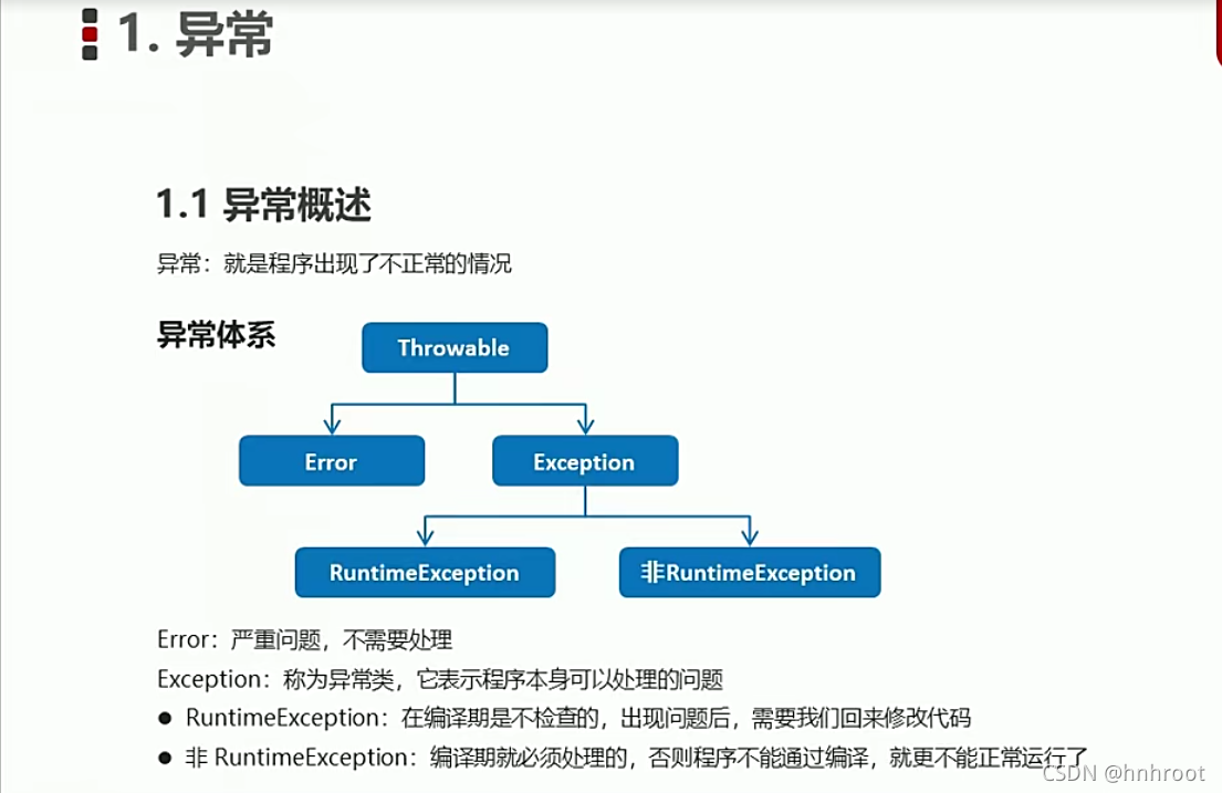 Throwable是java中所有错误和异常的超类,error没办法解决,可能会是硬件的问题,我们需要解决的是异常,RuntimeException是java虚拟机正常操作期间可以抛出的超类,RuntimeException系列的异常是需要回到代码中修改代码的,非RuntimeException是在我编译代码时候就必须修改的,否则无法通过编译
