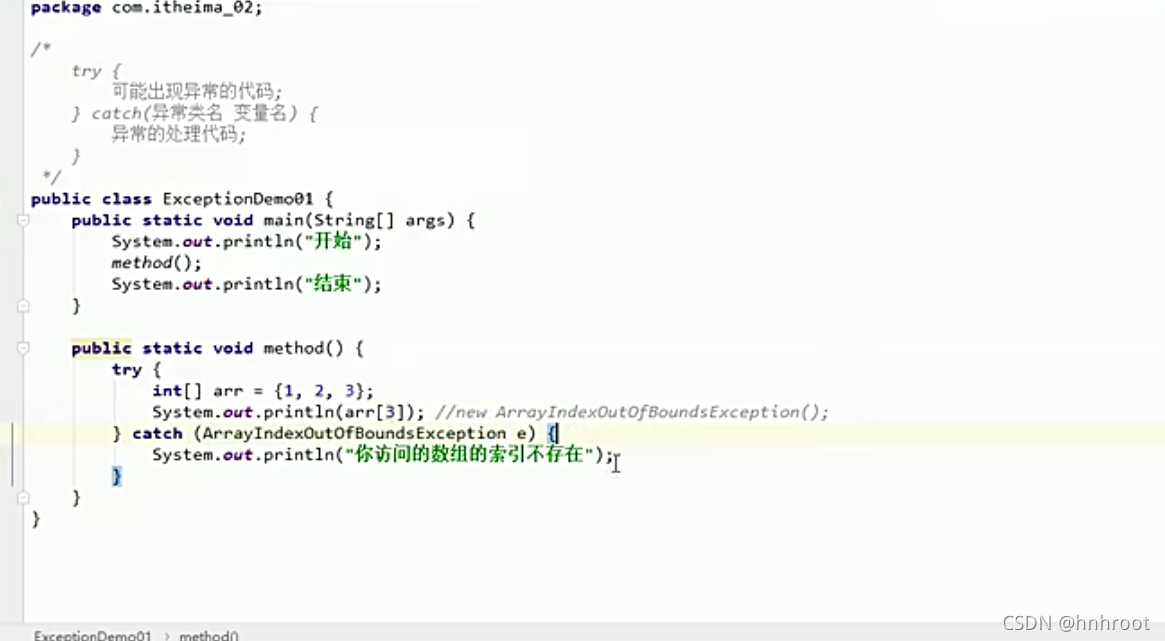 System.out.println(arr[3]);下标越界所以应该报ArrayIndexOutOfBoundsException的错,但是有catch(ArrayIndexOutOfBoundsExceptio e)所以会运行catch的代码,如果没有catch的时候代码会中断遇到错误,但是由于有catch(ArrayIndexOutOfBoundsExceptio e)他不会中端,即使中间出错也会给下继续执行输出结束,他是在System.out.println(arr[3]);出ArrayIndexOutOfBoundsExceptio 错,然后new一个ArrayIndexOutOfBoundsExceptio,在catch找到了就运行catch了.........e是一个对象,他有很多的方法