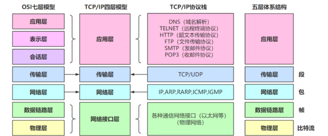 - 五层协议是 OSI 和 TCP/IP 的综合,实际应用还是 TCP/IP 的四层结构。