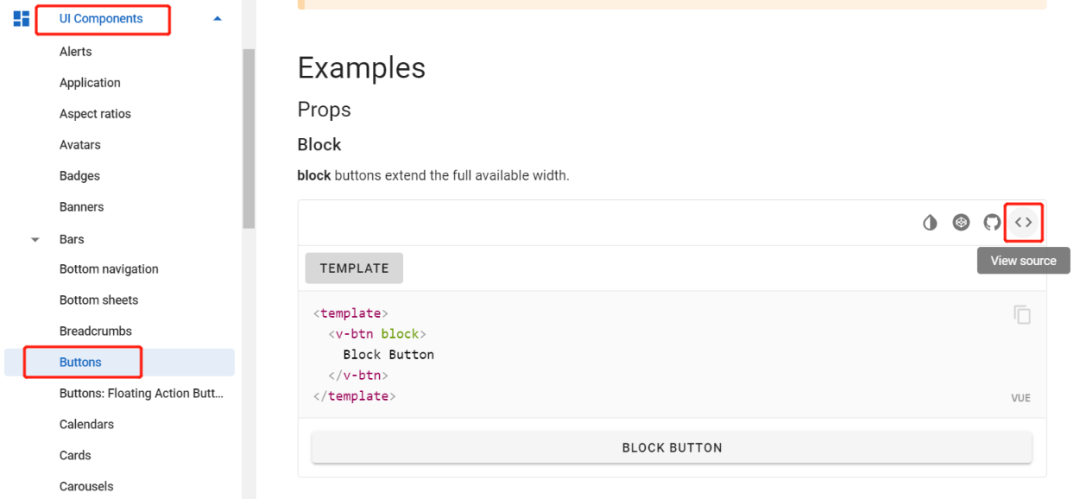 - 比如项目中需要一个按钮时,就可以到对用的组件下面找到它,将代码拿出来即可,里面有各式各样风格的组件:https://vuetifyjs.com/en/components/buttons/