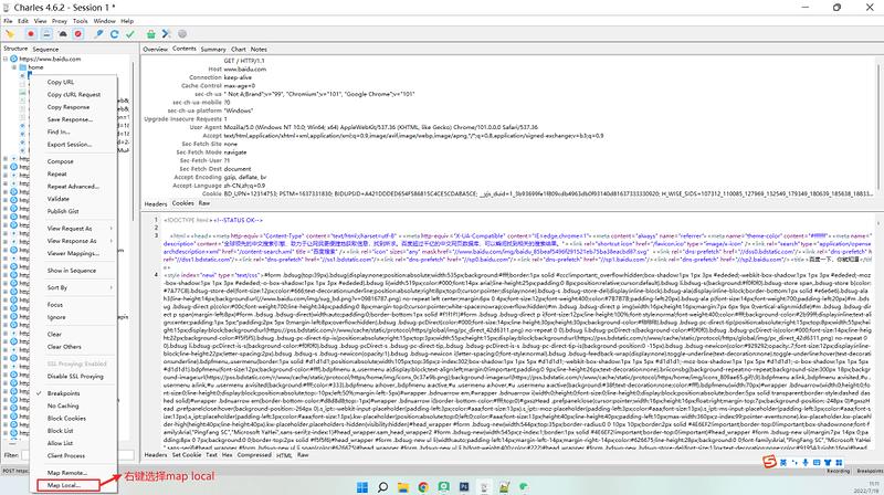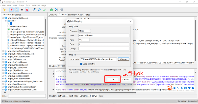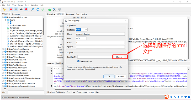3.设置 Charles 进行 map local,右键点击 Map Local->进入 Edit Mapping ->点击 choose ->选择修改后的 html->点击 OK