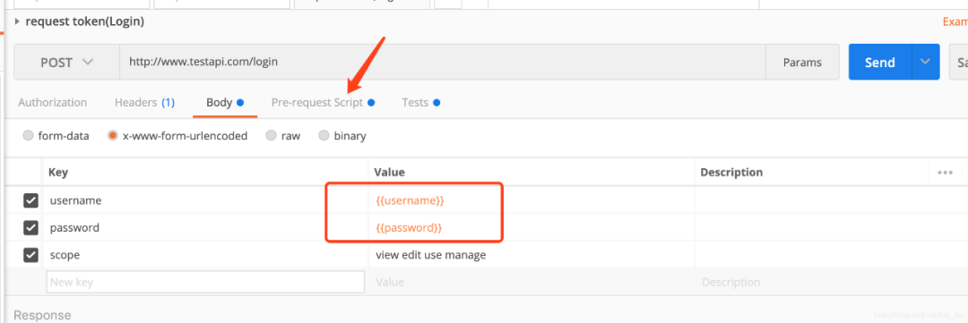 引用一个变量的语法:{{变量名}}, 图中可以看到,我们将账户和密码字段的参数值都设置为变量:{{username}} 、{{password}} 。修改完直接点击运行 (Send) 当然是不行的,因为目前这两个变量还未被赋值,不过我们可以在 Pre-request Script 面板中进行赋值操作:
