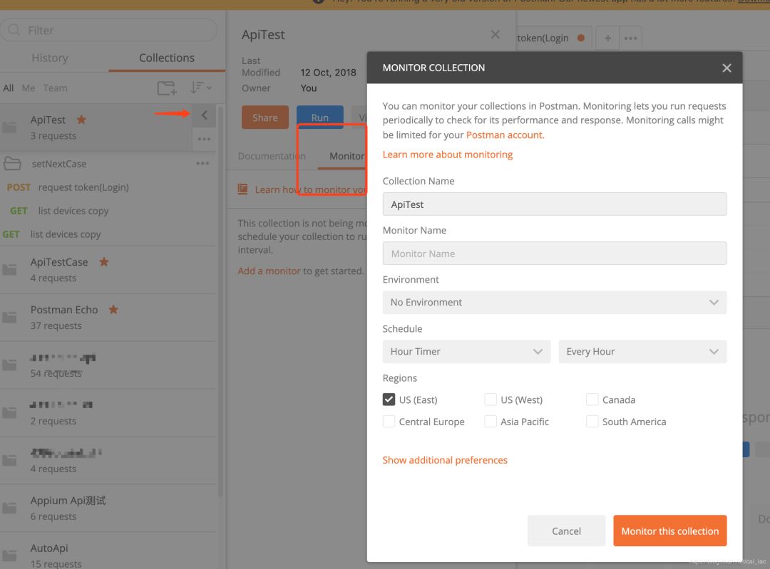 Postman 提供了一个 Monitors (监视器)功能,支持我们提交一个测试任务,按照设置的定时器进行运行,如每小时测试一次,具体操作如下: