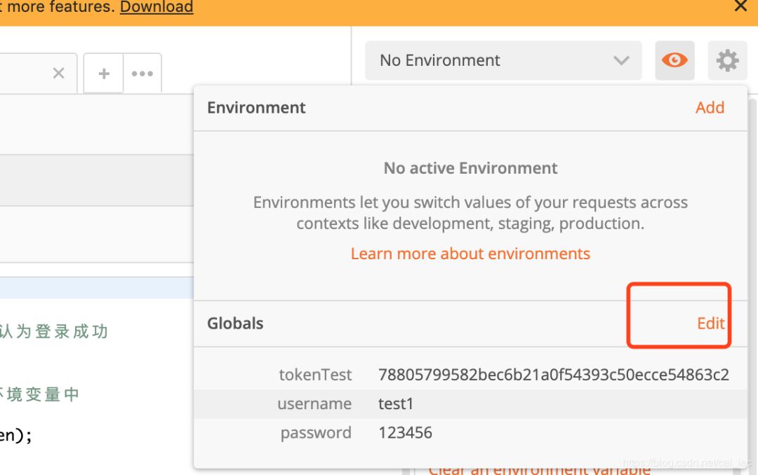 另外,Postman 不仅支持代码设置全局变量的方式,它还支持可视化操作: