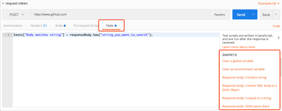Postman 在 SNIPPETS 功能区中为我们提供的代码模板已经能解决大部分情况了,以下先挑几个跟结果判断相关的进行讲解: