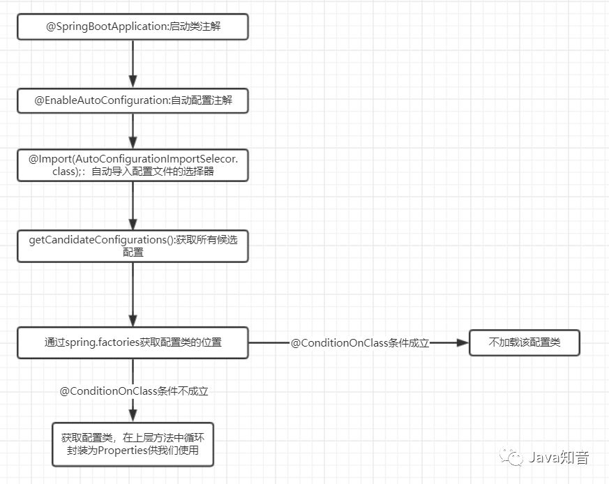 SpringBoot所有自动配置类都是在启动的时候进行扫描并加载,通过spring.factories可以找到自动配置类的路径,但是不是所有存在于spring,factories中的配置都进行加载,而是通过@ConditionalOnClass注解进行判断条件是否成立(只要导入相应的stater,条件就能成立),如果条件成立则加载配置类,否则不加载该配置类。