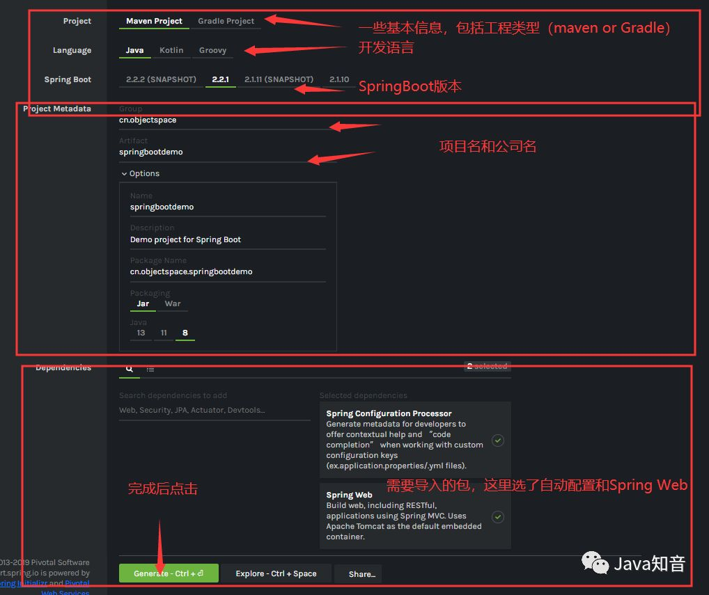我们只需要在这个网页中把整个项目起好名字,然后选好我们需要的组件,就可以直接获得一个可以跑起来的SpringBoot项目。