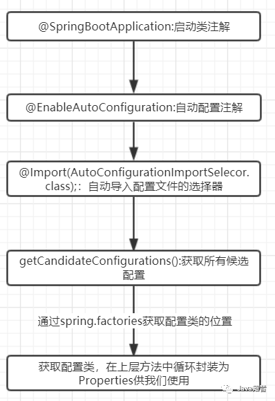 当我们的SpringBoot项目启动的时候,会先导入AutoConfigurationImportSelector,这个类会帮我们选择所有候选的配置,我们需要导入的配置都是SpringBoot帮我们写好的一个一个的配置类,那么这些配置类的位置,存在与META-INF/spring.factories文件中,通过这个文件,Spring可以找到这些配置类的位置,于是去加载其中的配置。