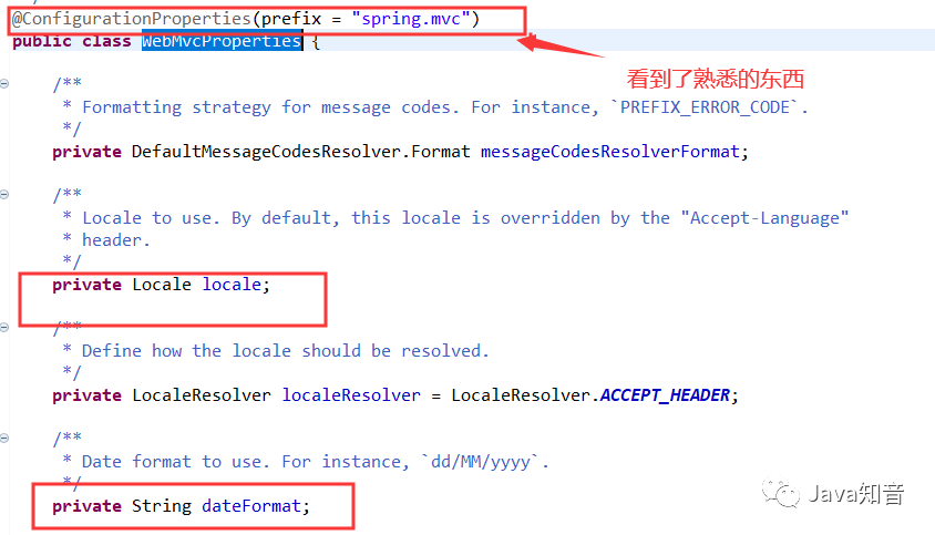 我们在yml中配置的date-format,就可以通过@ConfigurationProperties映射到类中的dateFormat中,然后在通过自动配置类,将这些属性配置到配置类中。
