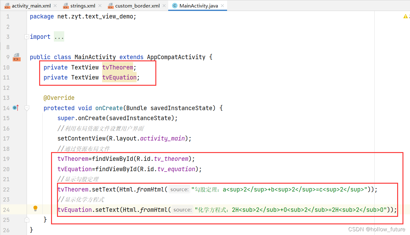打开主界面类 - MainActivity在里面写入勾股定理公式和化学公式,并且实现公式上标和下标