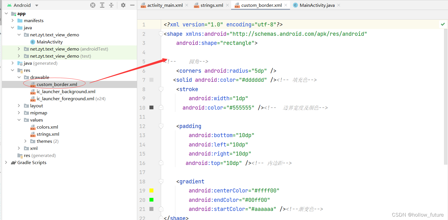 在drawable目录里创建自定义边框配置文件custom_border.xml并添加内容