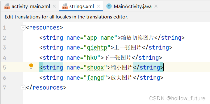 打开字符串资源文件strings.xml 输入代码