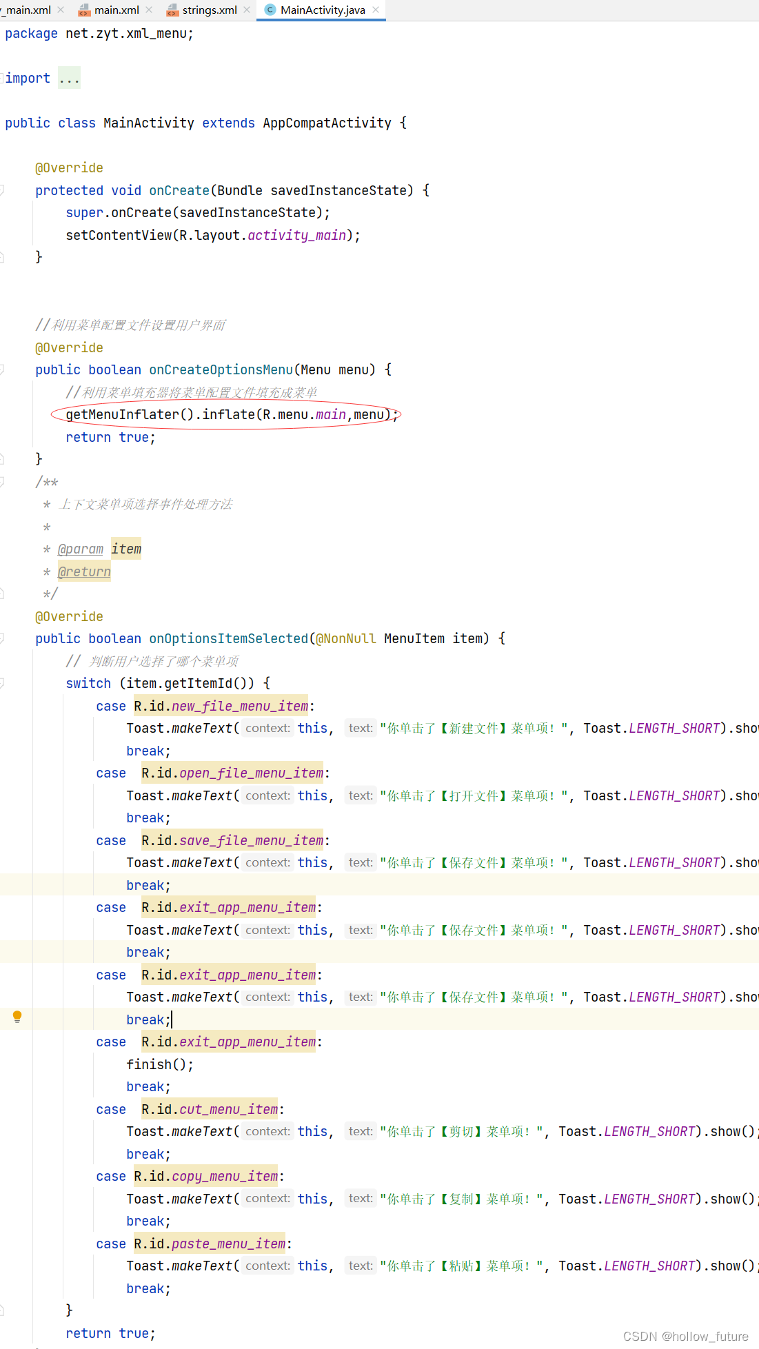 在res目录下创建menu目录,在里面创建菜单配置文件 main.xml输入代码:
