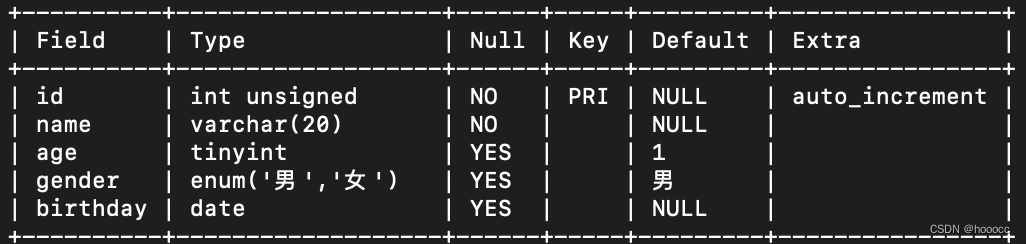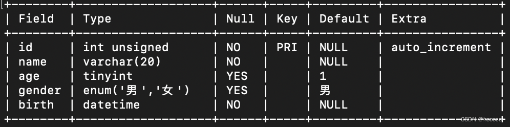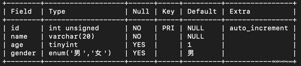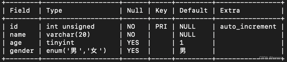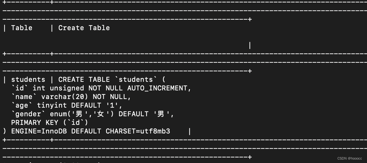 create table students(id int unsigned primary key auto_increment not null,name varchar(20) not null,age tinyint default 1,gender enum("男","女") default "男");