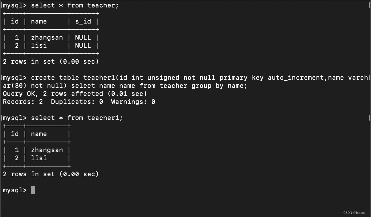 create table teacher1(id int unsigned not null primary key auto_increment,name varchar(30) not null) select name name from teacher group by name;