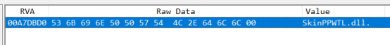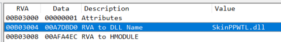 从图3中可以看到 ,加载的DLL的名字信息保存在了RVA的0x00A7DBD0中。从PEView中可以看到,该RVA位于“SECTION.rdata”中的“DELAY IMPORT DLL Names”中,如图4所示。