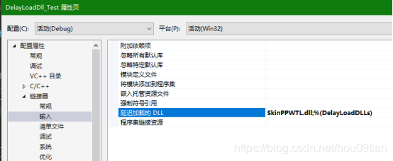 使用VS2015编写程序时,可以通过VS2015为该程序设置延迟加载的DLL。在VS2015中,选择菜单栏“项目->XXX属性”,之后在弹出的属性页左侧的“配置属性”中选择“链接器->输入”,之后在右侧的“延迟加载的DLL”中输入要延迟加载的DLL名,如图1所示。