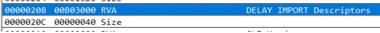 从图2中可以看到,延迟加载的DLL信息保存在0x00B03000的地址当中,该地址为相对虚拟地址,即RVA。从PEView中可以看到,延迟加载的DLL信息实际上是保存在了“SECTION.didat”中的“DELAY IMPORT Descriptors”中。图3为RVA是0x00B03000中的内容。