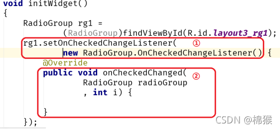 其中,layout3_rg1是图1中RadioGroup的ID,rg1是RadioGroup类的对象。通过rg1调用的setOnCheckedChangeListener()方法设置RadioGroup的响应(图6①),该方法的参数是实现RadioGroup.OnCheckedChangeListener接口的类的对象,在图6②中通过new创建了一个实现该接口的匿名类的对象,并且重写了该接口的onCheckedChanged()方法,当RadioGroup中的RadionButton选中状态发生变化时,就会调用onCheckedChanged()方法。该方法的第一个参数表示发生变化的RadioButton所在的RadioGroupd;第二个参数表示发生变化的RadioButton的ID。
