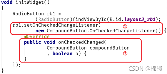 其中,通过rb1是图2中“hello”按键的对象,通过rb1调用的setOnCheckedChangeListener()方法(图5①)的作用是设置一个回调方法,当rb1表示的按键即“hello”被选中后,将会调用该方法。setOnCheckedChangeListener()方法的参数是CompoundButton.OnCheckedChangeListener接口的对象,该接口定义了一个回调方法onCheckedChanged(),当按键被选中之后,会调用该方法。在图5①中可以看到,setOnCheckedChangeListener()方法的参数中通过new创建了一个实现CompoundButton.OnCheckedChangeListener接口的匿名类的对象,在该匿名类中重写了回调方法onCheckedChanged()(图5②)。回调方法onCheckedChanged()的第一个参数指定了状态发生改变的按键,第二个参数表示选中状态的变化,当按键从未选中变为选中时,b的值是true,当按键从选中变为未选中时,b的值是false。