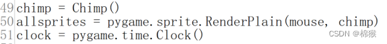 在主程序中首先创建Chimp()类的实例,如图5中49行代码所示;之后将chimp加入到sprite的Group中;最后定义pygame.time.Clock()类的实例clock,用于控制图片移动速度。