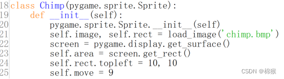 创建一个表示猩猩图片的类Chimp,该类也是pygame.sprite.Sprite类的派生类。