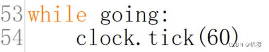 为了控制图片移动速度不能过快,在while going循环中,加入clock.tick()代码控制移动速度,代码如图6中54行所示。
