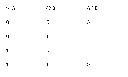 按位异或是一个二元操作,它对两个等长的二进制数的每一位进行独立的逻辑“异或”操作。其运算规则如图11所示。