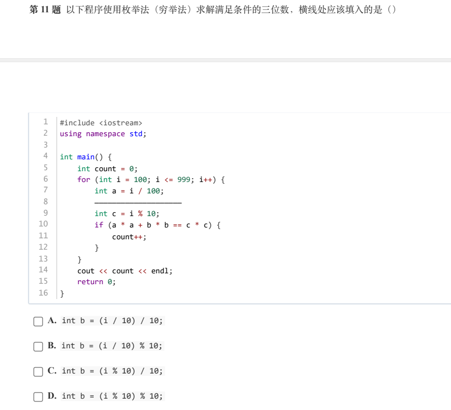 本题考点为“枚举算法”,第8行代码的作用是提取三位数的十位数,因此本题选B。