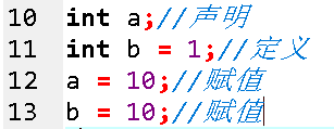 声明(Declaration):告诉编译器“这个名字存在,它的类型是什么”,此时变量没有初始值。定义(Definition):告诉编译器“在这个地方创建这个变量,并为其分配内存”,变量有初始值。赋值(Assignment):给一个已经定义的变量一个具体的值,使用=运算符赋值,如图8所示的代码。