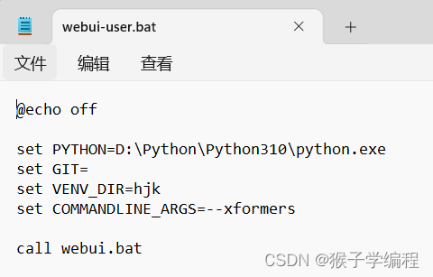 下载下来后windows系统打开目录下的文件webui-user.bat,set PYTOHN替换为你的安装路径