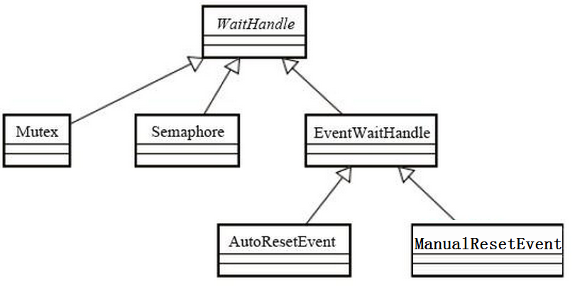 EventWaitHandle(子类为AutoResetEvent、ManualResetEvent)、Semaphore以及Mutex都继承自WaitHandle,所以它们底层的原理是一致的,维护的都是一个系统内核句柄。不过我们仍需简单地区分这三个类的类型。