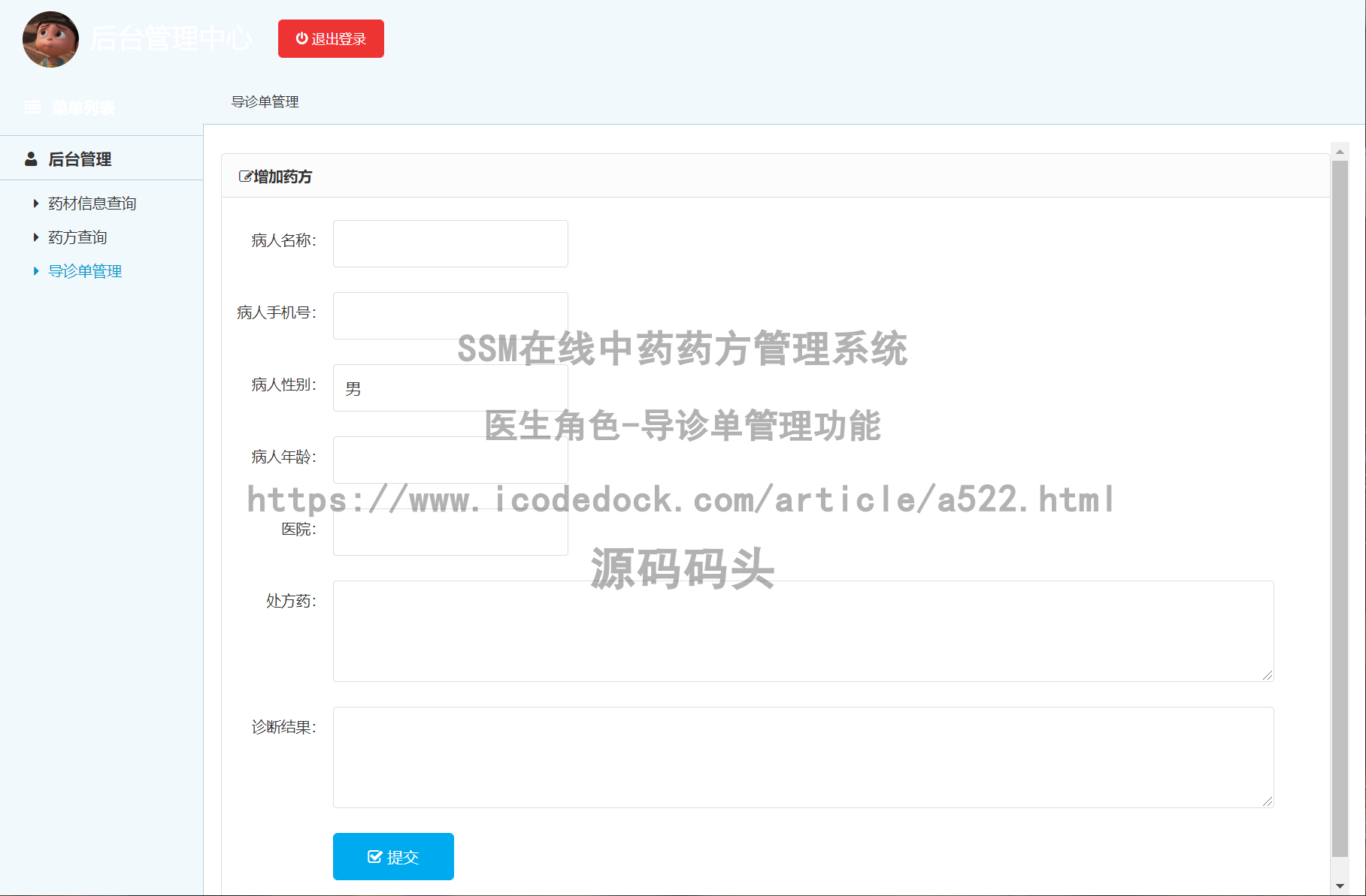 #### SSM在线中药药方管理系统-医生角色-导诊单管理↓↓